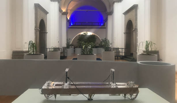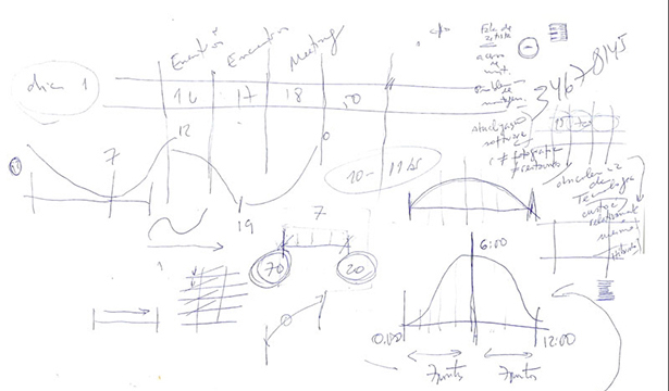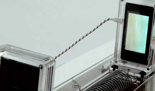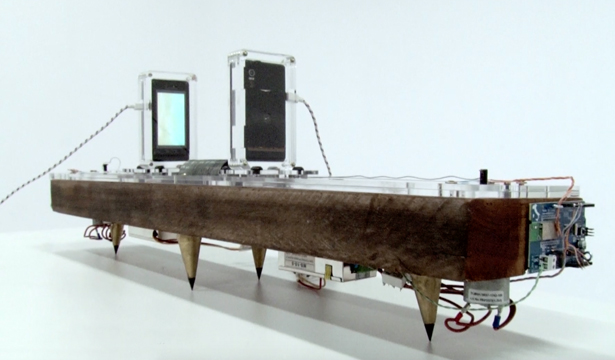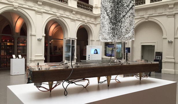 O dispositivo busca informações em tempo real, de modo a refletir as mudanças das marés e das fases da lua, de um lado, em contraponto ao fluxo de acesso à palavra "encontro" em diversos idiomas, do outro.