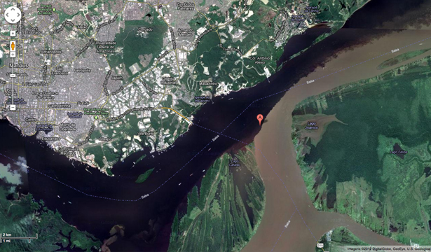 Dois aparelhos celulares exibem vídeos realizados em viagem pelo Rio Amazonas de fluxos de águas de duas tonalidades distintas: de um lado, a predominância da cor preta e, do outro da cor marrom.